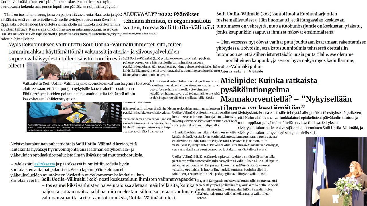 Kangasalalaisen hyvinvointia ylläpitää ja edistää kokonaisuudet, joita kaupunki toimillaan päättää ja edistää. Tekemisen ytimessä tulee olla asukas. Hyvinvointi on nimittäjänä kaikille vaaliteemoilleni. Pidän tärkeänä kaupunkilaisen mahdollisuutta osallistua ja vaikuttaa.